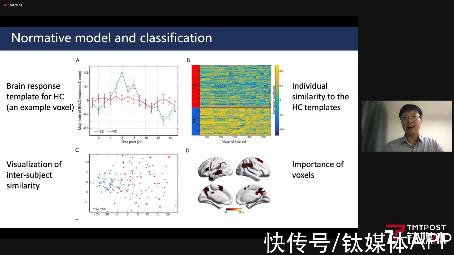 作为研讨会上第一位演讲嘉宾,上海交通大学心理与行为科学研究院特聘研究员、TCCI转化中心研究员杨志博士,在线上分享了他与科研团队在去年8月1日《NeuroImage》(神经影像)杂志上发表的一篇重要研究成果:利用开发的一种个性化的精神病神经影像技术,基于126名参与者在观看电影剪辑时记录到的大脑活动,就可以检测识别出具有精神分裂症特征的患者。结果显示,通过训练SVM分类器(机器学习分析样本工具)识别精神分裂症参与者,在交叉验证测试中获得了71-78%的准确率,在独立的验证数据中实现了95%的准确度、100%的灵敏度和90%的特异性。